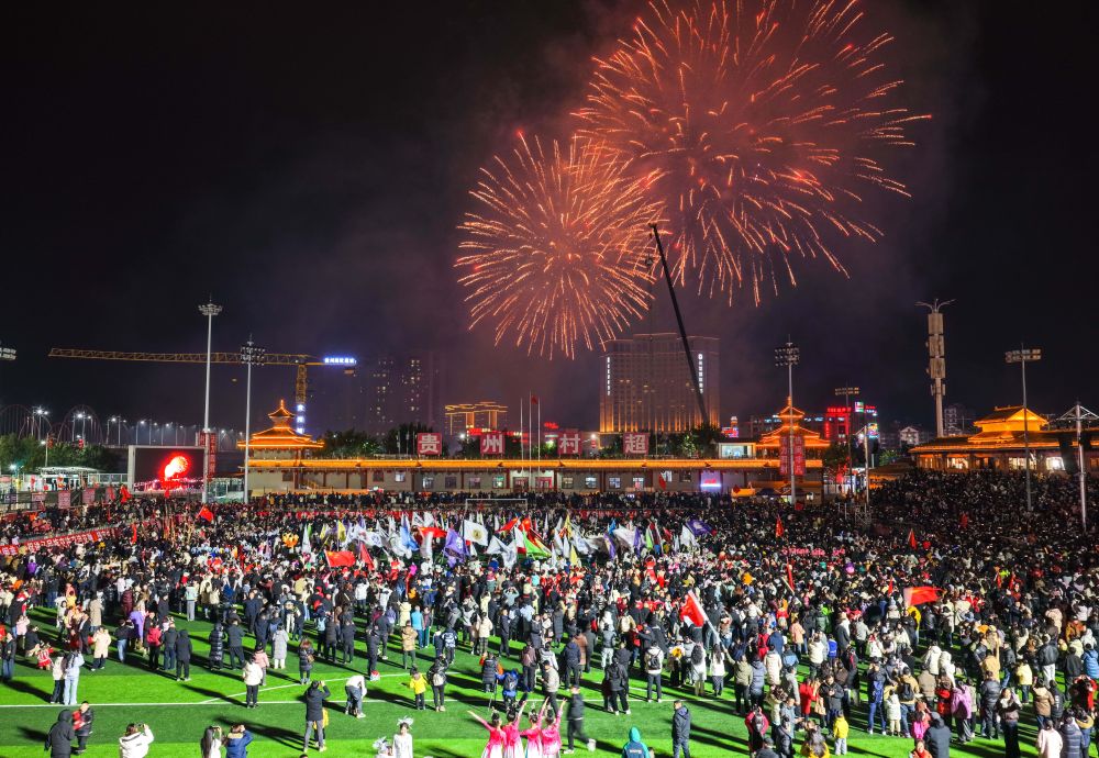 1月2日,人们在活动现场观看烟花表演(无人机照片)。当日,第四届贵州“村超”开幕式暨“村超村晚”活动在榕江县举行。新华社记者 杨文斌 摄