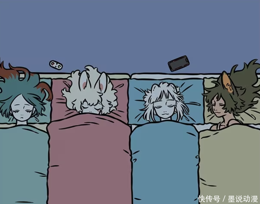 一开始,九月、瓦陶陶、精卫和小玉都睡得很安分。可以看出小玉戴了美瞳,睡觉之前将美瞳拿下来,放在盒子里。九月则是将手机放在头顶上。瓦陶陶和精卫的睡姿看起来很优雅,有种淑女的感觉。然而这仅仅只是感觉,接下来的操作,九月就要遭殃。